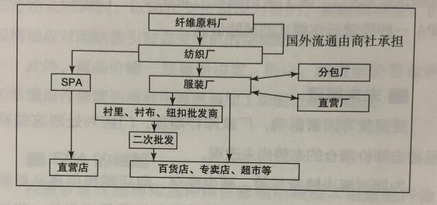 首先,纖維原料在“纖維原料廠”制成絲線,絲 線在“紡織廠”經(jīng)過織、編、染色等工序制成布料一布料經(jīng) “眼裝廠”的開發(fā)、企劃階段分包或直營縫制廠,在縫制廣制 成衣料,襯里、襯布、紐扣批發(fā)商部分加工后經(jīng)批發(fā)(二次批 發(fā)等)環(huán)節(jié)最終進(jìn)入百貨商店、專營店、綜合超市、郵購等 “零售商”的柜臺銷售。 當(dāng)然,上述每一道工序都涉及流通和分包。“服裝廠”大 多兼營批發(fā),作為生產(chǎn)批發(fā)企業(yè),對零售、二次批發(fā)和縫制 廠等也具有一定的影響力。 隨著行業(yè)上游的“纖維原料廠”、“布料廠”等向中國轉(zhuǎn) 移,現(xiàn)在日本國內(nèi)的服裝業(yè)主要由伊藤忠、丸紅、三井物產(chǎn) 等商社操控整個流通環(huán)節(jié)。近年來,縫制廠從日本國內(nèi)轉(zhuǎn)向 中國的趨勢越來越明顯,為應(yīng)對流通加工過程的變化,開始 從生產(chǎn)地直接發(fā)往日本店鋪。 推動產(chǎn)品企劃和開發(fā)進(jìn)程的日本服裝制造企業(yè)有World、 ONWARD橙山、五狐(FIVEFOXES)、伊都錦四大服裝巨 頭。零售商中知名度較大的如青山商事專營店、AOKI控 股,從事衣料品零售的迅銷(FAST RETAILING)、島村等。