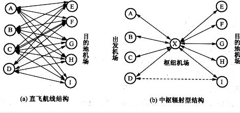現(xiàn)在世界上的樞紐航線網(wǎng)絡(luò)有多種構(gòu)型,但最基本的是跨境物流航線結(jié)構(gòu)。 基本航線結(jié)構(gòu)特點(diǎn)可以看到,城市對直飛航線適宜于航空客貨運(yùn)輸 量充沛的市場。對于一些乘坐率不高的航線,航空公司既要保持市場占有,又要保障航班 效益,特別是國際航線,通常與航線多、航班密度高的區(qū)域性中心機(jī)場或大型門戶機(jī)場 (gateway)之間構(gòu)建所示的跨境物流航線結(jié)構(gòu)(hub and spoke)。