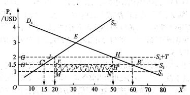 第二,利益與損失的測量與測度內(nèi)容:系統(tǒng)相關(guān)性問題綜合判斷。B國由于和C 國建立關(guān)稅同盟所產(chǎn)生的靜態(tài)福利效應(yīng)可以陰影部分面積計 算與測度。陰影三角形CJ和BHFH'的面積之和(8.75 USD)是從純貿(mào)易創(chuàng)造中產(chǎn) 生的福利收入,而陰影矩形MNHJ(15USD)面積是從A國低成本轉(zhuǎn)向B國以高成 本在同盟內(nèi)進口30X(JH)所造成的福利損失。JMNH(30USD)屬于C國的消費者, 因此關(guān)稅同盟形成以后,X商品的價格降低了,僅留下陰影三角形CJJ”和BH日'作 為B國的凈收入,并且陰影矩陣MNHJ’作為關(guān)稅收入損失。 第三,不同商品彈性影響的政策效果評價。由于測度貿(mào)易轉(zhuǎn)向福利損失的陰 影面積(15USD)大大超過了測度從純跨境電商物流創(chuàng)造取得的福利的陰影三角形面積之 和(3.75USD)。對于B國來說,導(dǎo)致11.25USD凈福利損 失。但情況非不總是這樣,Dx和Sx曲線越平緩(即在活 當(dāng)范圍內(nèi)彈性更大)并且S,越靠近S,則陰影三角形面積之和越大,而陰影矩形面 積越小。所以,即使貿(mào)易轉(zhuǎn)向型關(guān)稅同盟也有可能導(dǎo)致同盟參加國獲得凈福利。